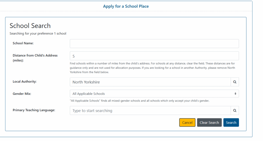 If you are applying via North Yorkshire Council as that is the area in which you live, please be aware that the search defaults to North Yorkshire schools so you need to use the Advanced Search option in the blue box. See the screenshot below: